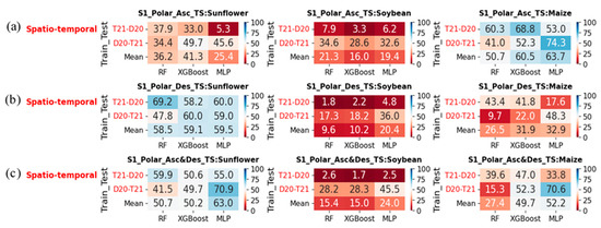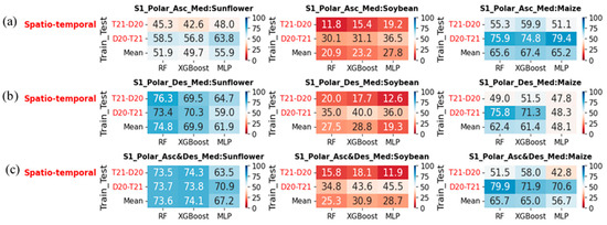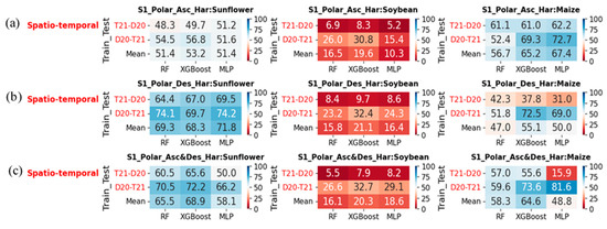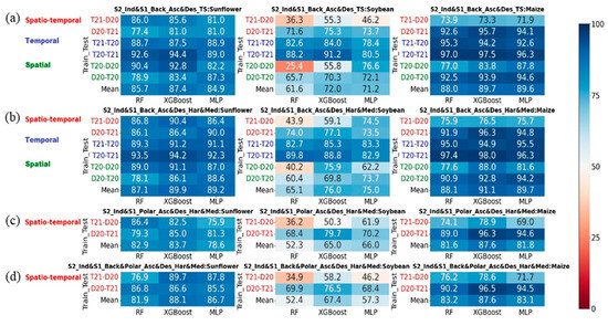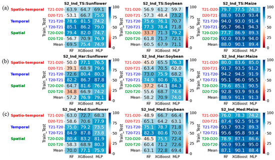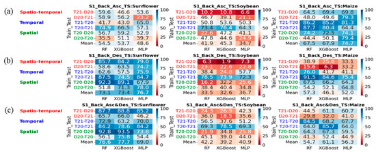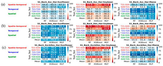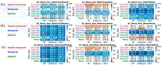 To evaluate the potential of S1 and S2 images and their extracted features in mapping three summer crops—maize, sunflower, and soybean—we employed RF, MLP, and XGBoost to classify our datasets across several dataset scenarios and train-test combinations. The classification categories included four classes: maize, sunflower, soybean, and other crops.