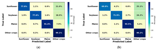 Three machine learning classifiers, namely Random Forest (RF), Extreme Gradient Boosting (XGBoost), and Multi-Layer Perceptron (MLP), were applied for mapping our three summer crops by evaluating different input data scenarios among our S1 and S2 data. RF is a popular machine learning method, making it a strong reference point for comparing the accuracy of other models. XGBoost is a more advanced machine learning technique that has shown high accuracy for crop mapping in previous studies [60,61,62]. MLP is a basic type of neural network that represents a simple form of artificial neural networks (ANNs). Additionally, the InceptionTime neural network, a specialized algorithm for time series classification, was used to classify the S1 and S2 time series data. The InceptionTime classifier is underexplored but has demonstrated high performance in previous studies on crop type mapping [63,64]. In our previous research, InceptionTime consistently outperformed other models, including RF, MLP, and LSTM_FCN, particularly in transfer scenarios [64]. It achieved the highest accuracy for crop mapping tasks and demonstrated remarkable stability, with the smallest range between minimum and maximum accuracy metrics. However, InceptionTime requires significantly more computation time for the training stage compared to the other three classifiers. Employing these four algorithms enables us to evaluate the performance of a time series-specific algorithm that relies solely on non-tabular data (sequential data, such as time series) against general machine learning algorithms that utilize both tabular (structured data organized in rows and columns) and non-tabular data. In many cases, tune model hyperparameters can improve performance. However, in this study on model transferability, where the training and test datasets exhibit different distributions, optimizing hyperparameters based on a validation set that includes only held-out training data may not lead to robust results on the test set. For this reason, we chose to use default parameter settings, which are typically designed to perform adequately across a variety of general scenarios. The classification was conducted using Python 3.11. Our Python implementation codes for classification can be found at https://github.com/cassiofragadantas/Colza_Classif, accessed on 30 April 2024 and https://github.com/Saeideh-Maleki, accessed on 30 April 2024.