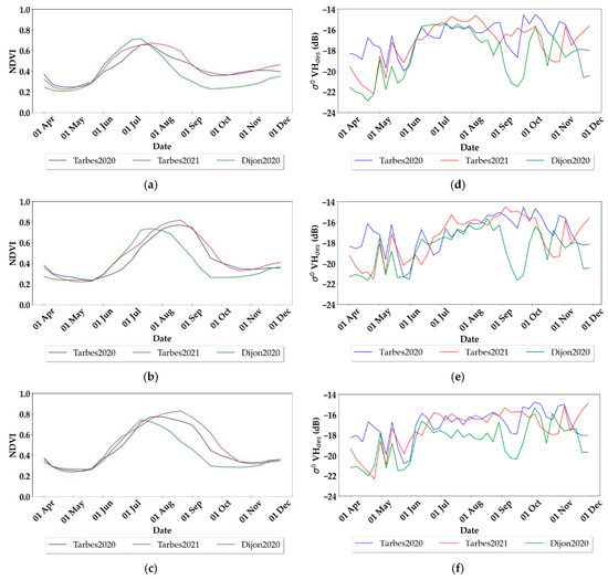 To generate each S1 backscattering coefficients and S1 polarimetric time series at the field level, the mean value using all pixels in each field was used. Each time series covered the entire growth period of the summer crops in the study site, aligned with the same period as the S2 time series, from 1 April to 1 December each year. For each orbit, the S1 polarimetric parameter and S1 backscattering coefficients time series contained 41 images per study site and year. The S1 backscattering coefficients time series was generated for Tarbes in 2020 and 2021 and for Dijon in 2020 (Table 3). Given that the time required to generate polarimetric data are very high (one month per site), we chose to use the polarimetric data for the S1 polarimetric time series for Tarbes in 2021 and Dijon in 2020 (Table 3).