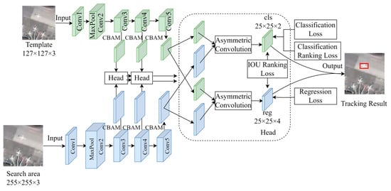 To address these challenges, we propose an enhanced Siamese network for object tracking in remote sensing videos, incorporating a cross-correlation and ranking head based on the SiamRhic architecture. By incorporating the CBAM (Convolutional Block Attention Module) attention mechanism, the tracker can focus more on the object and effectively ignore irrelevant backgrounds, thereby enhancing the representational power of the convolutional features. The use of asymmetric convolution effectively mitigates interference from distracting objects when applying the depth-wise cross-correlation algorithm in the SiamRPN++ [18] network for remote sensing images. Finally, to address high confidence in distracting items and the mismatch between classification and regression, we introduce a ranking loss integrated with the original loss function to optimize network training. These improvements enhance the network’s performance without introducing significant resource overhead.