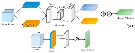where denotes the input feature map, σ denotes the Sigmoid function, MLP denotes the fully connected layer, and AvgPool and MaxPool denote the average pooling and maximum pooling operations, respectively, W0 and W1 denote the fully connected layer weights, denotes the average pooled features, and denotes the maximum pooled features.