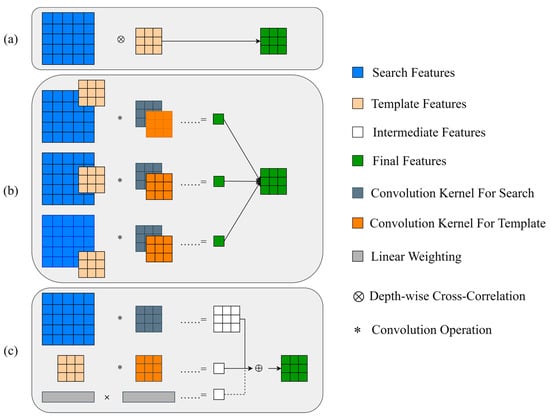 where denotes the fused features, and denote the convolution kernels acting on and , respectively, denotes the template frame feature map, denotes the search frame feature map, and b denotes the learnable weight parameters.