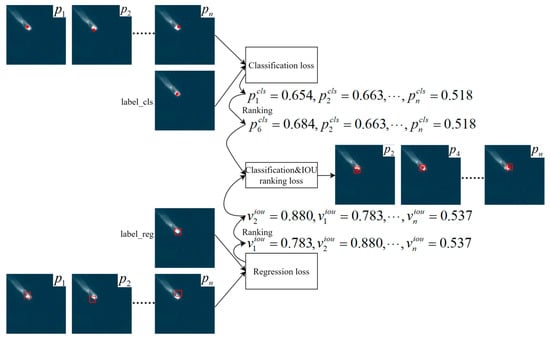 where controls the loss value, is the ranking edge, and and are the expectation values of difficult negative and positive samples. To address the mismatch between classification and regression, an IoU ranking loss is introduced, as shown in Figure 5. The positive sample with the highest classification confidence and IoU is selected as the final result, aiming to improve tracking precision. This loss links the classification and regression branches, ensuring that classification scores accurately reflect class identification and object frame prediction. This coordination optimizes both branches simultaneously. The IoU ranking loss is defined as shown in the following equation.