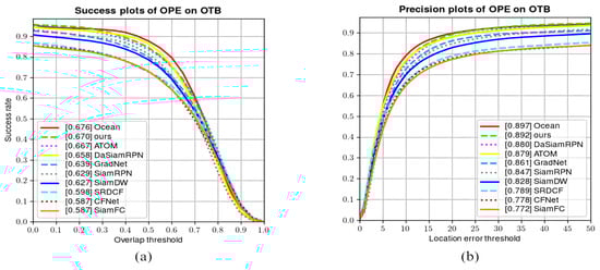 The precision and success rates of our tracker compared to other trackers on the OTB100 dataset. (a) Success plots; (b) Precision plots.
