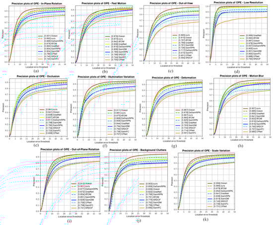 The precision of our tracker in comparison to other trackers across the 11 challenges of the OTB100 dataset. (a) In-plane Rotation; (b) Fast Motion; (c) Out-of-view; (d) Low Resolution; (e) Occlusion; (f) Il-lumination Variation; (g) Deformation; (h) Motion Blur; (i) Out-of-plane Rotation; (j) Background Clutter; (k) Scale Variation.