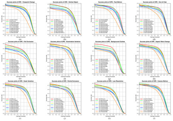 The success rates of our tracker, along with those of the comparison trackers, are assessed across the twelve challenges of the UAV123 dataset. (a) Viewpoint Change; (b) Similar Object; (c) Fast Motion; (d) Out-of-view; (e) Full Occlusion; (f) Illumination Variation; (g) Background Clutter; (h) Aspect Ratio Variation; (i) Scale Variation; (j) Partial Occlusion; (k) Low Resolution; (l) Camera Motion.