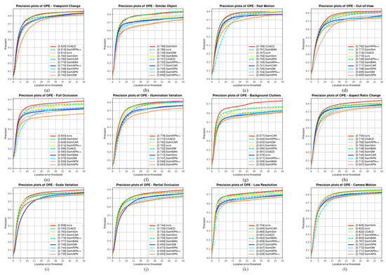The precision of our tracker, as well as that of the comparison trackers, is evaluated across the twelve challenges presented in the UAV123 dataset. (a) Viewpoint Change; (b) Similar Object; (c) Fast Motion; (d) Out-of-view; (e) Full Occlusion; (f) Illumination Variation; (g) Background Clutter; (h) Aspect Ratio Variation; (i) Scale Variation; (j) Partial Occlusion; (k) Low Resolution; (l) Camera Motion.
