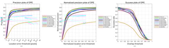 The precision, normalized precision, and success rates of both our tracker and the comparison trackers are assessed on the OOTB dataset. (a) Precision plot; (b) Normalized precision plots; (c) Success plots.