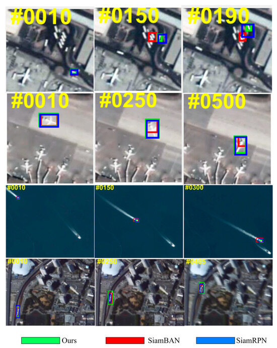To illustrate tracking performance, we present results for common object categories in remote sensing scenes, such as cars, airplanes, ships, and trains, as shown in Figure 14. The green box represents the tracking results of our algorithm, the blue box denotes the results of the SiamRPN algorithm, and the red box shows the outcomes of the SiamBAN algorithm.