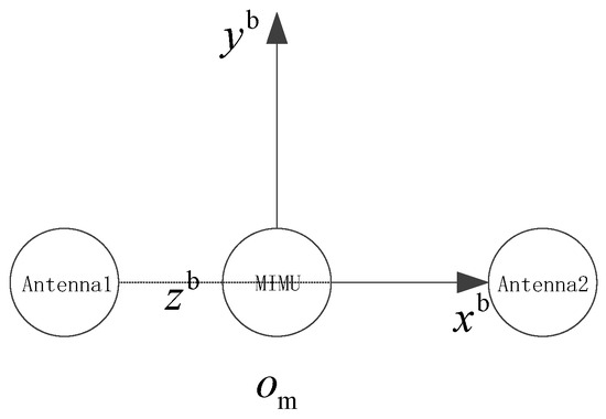 As illustrated in Figure 2, two antennas and an MIMU are solidly connected to the carrier. Antenna 1 serves as the origin of the body coordinate system. The baseline vector between the two antennas aligns with the X-axis of the carrier coordinate system. The X-axis of the MIMU body coordinate system is parallel to the X-axis defined for the carrier coordinate system. The plane of the MIMU body coordinate system coincides with the plane of the carrier body coordinate system. The Y-axis of the MIMU body coordinate system is parallel to the Y-axis defined for the carrier coordinate system.