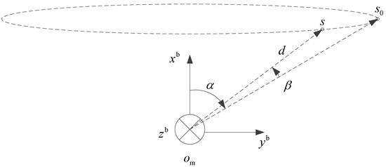 For a brief period, the body system error in the process of MIMU-assisted rotation does not significantly vary with time. The value of the signal source in the b system at different moments can be expressed as . The distance from the carrier to the signal source is much larger than the change in the position of the signal source, i.e., .