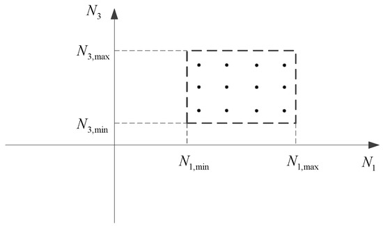Domains and standardised points of inter-station single-difference integer ambiguities on B1 and B3. The square area represents the range of values for carrier phase ambiguities N1 and N3. Due to the integer constraints for N1 and N3, the feasible candidates for (N1, N3) can be illustrated as the dots in the square area.