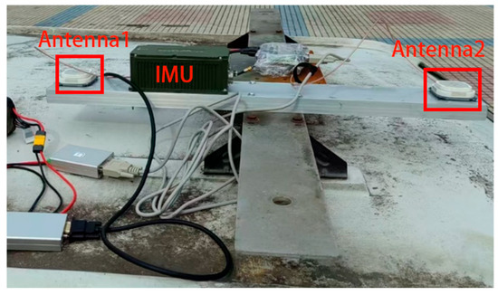 As depicted in Figure 6, two antennas and an MIMU were firmly connected to the carrier; the X-axis of the MIMU body coordinate system coincided with the X-axis defined for the carrier coordinate system; the plane of the MIMU body coordinate system coincided with the plane of the carrier body coordinate system; the Y-axis of the MIMU body coordinate system was parallel to the Y-axis defined for the carrier coordinate system. To obtain the high-precision position and attitude information of the carrier, we installed a high-precision INS in the vehicle body, where the plane of the MIMU body coordinate system coincided with the plane of the carrier body coordinate system and the Y-axis of the MIMU body coordinate system was parallel to the Y-axis defined for the carrier coordinate system.