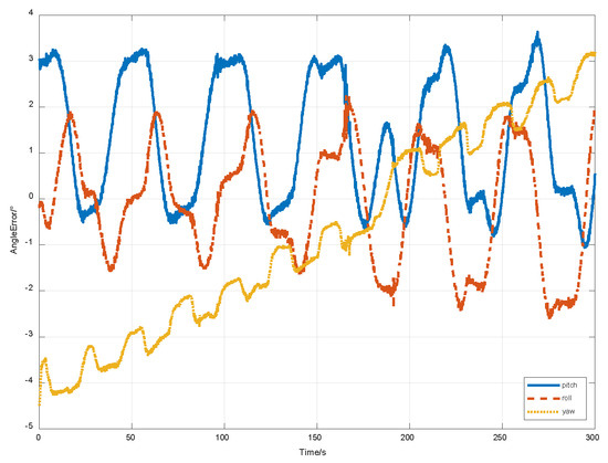 As indicated in Table 4, the experimental results indicate that distance has a significant impact on the directional accuracy of the method, and when the distance is too close, the pitch angle error is greater than the yaw angle error. However, the errors are within an acceptable range at all distances, suggesting that the method has good adaptability in practical applications. Combining the attitude angle error curve of inertial navigation in Figure 10, it can be observed that the fluctuation peaks of the orientation error curve in Figure 9 and Figure 11 are related to the changes in inertial navigation errors.