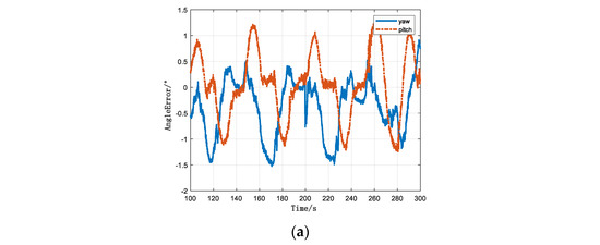 Figure 9a depicts that the error in the two-dimensional heading angle of the signal source was basically less than 0.1 rad, which was in line with the expected positioning error for the signal source. When the difference between the distance of the signal source distance and the motion amplitude of the carrier was not obvious, the pitch angle error of the signal source rapidly increased, but the heading angle maintained high accuracy. When the system was applied to signal-source position search or fused with the zeroing antenna technology, it retained high reliability and effectiveness.