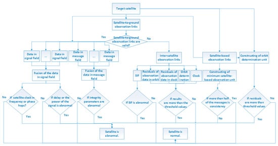 - When there are no valid satellite-to-ground observation links, inter-satellite ranging data and autonomous navigation messages should be gained through inter-satellite links. The state of the target satellite can be judged by five kinds of information: SIF, residuals of observation data in orbit, residuals of observation in a clock, the difference value of orbit determination errors (), and the difference value of absolute clock errors (). If SIF, residuals of observation data, and/or difference value exceed the limitation, the target satellite may be abnormal.