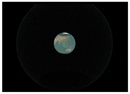 Based on the orbit inclination and altitude of BDS-3 MEO satellites, the spatial region surrounding the Earth could be divided into 8242 grid points by 2° × 2° intervals. With six IGS stations (BJFS, CHAN, HKSL, LHAZ, URUM, and WUH2) in China chosen as ground monitoring stations, the basic scenario is shown in Figure 7. Moreover, LEO satellites with an orbit height of 1000 km and an inclination of 55° could effectively observe the grid points. The observation elevation angle of receivers for the grids is set to be 10°.