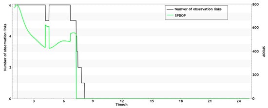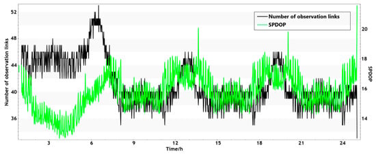 - In scenario 1, the valid number of observation links is only 1.60. The minimum and average values of SPDOP are 428.02 and 545.00, respectively, which is quite large even with the support of six stations synchronously, as shown in Figure 11.