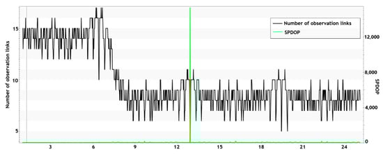Figure 13. Number of available links and SPDOP values in scenario 3.