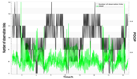 - As shown in Table 6 and Figure 15, PDOP could be improved by the addition of satellite-based observation links. There is no significant difference in PDOP values among different regions, meaning that the deployment of the constellation is relatively uniform.