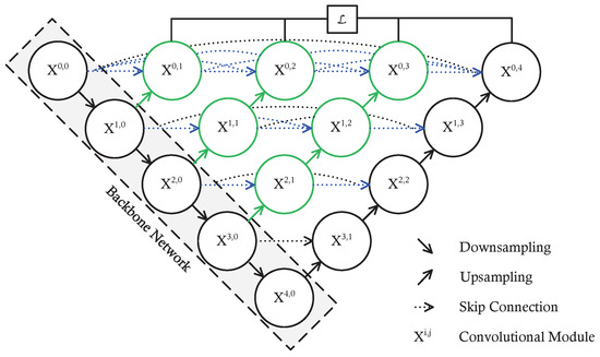 Unlike the UNet [25] architecture, this model reduces the semantic gap between the encoder and decoder through the implementation of skip connections. Additionally, it incorporates deep supervision by integrating the output of the top skip connection layer into the loss function, thereby enabling the model to be adjusted for varying levels of complexity. While UNet++ demonstrates a clear advantage in reducing the semantic gap between the encoder and decoder, it still exhibits certain limitations when processing complex scenes. For instance, its inability to adequately capture local features may certainly result in noisy output images and indistinct contours.