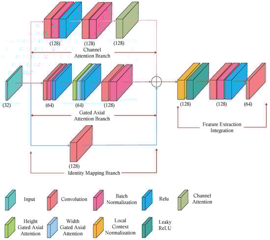 To enhance the feature representation, contextual information perception, and long-range dependency awareness during the encoding stage, this paper innovatively proposes a feature extraction module called ACLNM. This module effectively enhances the network’s multi-scale perception capability and contextual information integration by incorporating local contextual normalization, gated axial attention mechanism, and channel attention mechanism, thereby significantly improving the performance and robustness of segmentation tasks. The schematic diagram of ACLNM is shown in Figure 3.