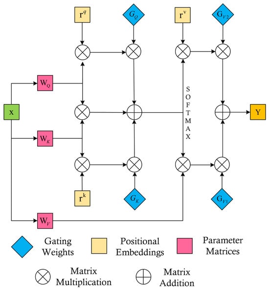 In Equations (8) and (9), , , , and are learnable parameters that collectively create a gating mechanism to control the influence of relative positional encoding on global contextual information. If the relative positional encoding is learned accurately, the gating weights will be higher; otherwise, the weights will diminish. The overall gated axial attention mechanism is illustrated in Figure 4.