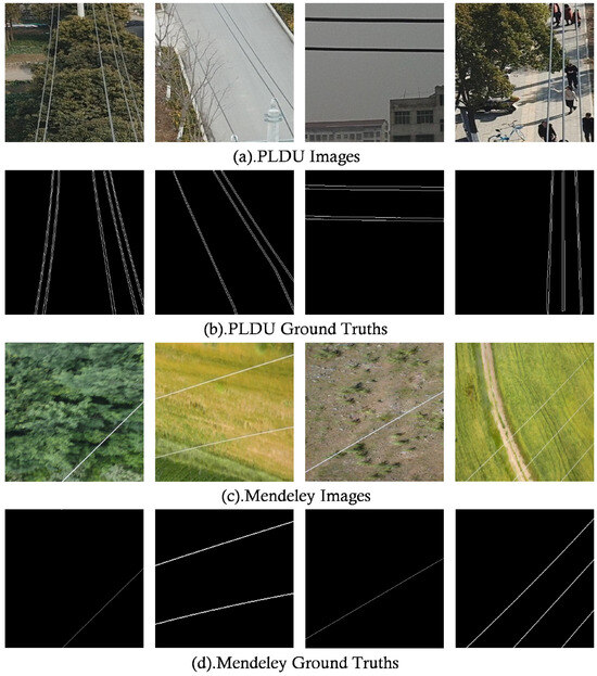 Powerline dataset for urban scenes (PLDU) dataset is available at https://drive.google.com/drive/folders/1XjoWvHm2I8Y4RV_i9gEd93ZP-KryjJlm, accessed on 20 September 2023. Ground truth of powerline dataset (Mendeley) is available at https://data.mendeley.com/datasets/twxp8xccsw/9, accessed on 20 September 2023. The test set after data augmentation is published at the following link: https://github.com/DingHu-SEU/PLDU-Augmented, accessed on 12 October 2024.