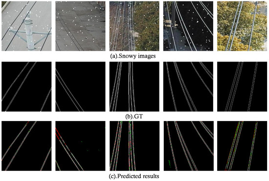 Experimental results in a snowy environment. In the predicted results, FN pixels are represented in red, while FP pixels are indicated in green.