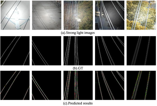 Figure 14 illustrates that motion blur causes the edges of power lines to become indistinct and may result in the disappearance of fine lines and structural details, thereby increasing the difficulty of segmentation. The prediction results reveal the occurrences of discontinuities in the power line segmentation (see the first, third, and fourth images), as well as some degree of endpoint omission (see the second and third images). Despite the challenges posed by motion blur, the model demonstrates high distinction in power line segmentation overall, maintaining clear contours and distinct shapes, and exhibits a certain level of robustness.