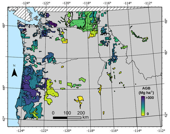 The study area for this analysis consists of forested landscapes in Oregon, Washington, Idaho, and Eastern Montana (Figure 1). Due to orographic effects, there is a pronounced east–west precipitation gradient. Forests in the Coast Range and the western slopes of the Cascades receive 800–3000 mm of precipitation annually [42,43], while forests in Idaho and Montana receive considerably less precipitation (<400 mm a year) [6]. The Douglas-fir (Pseudotsuga menziesii) and western hemlock (Tsuga heterophylla) forests on the Olympic peninsula in Washington, the Oregon and Washington Coast Range, and the Oregon and Washington Cascades are among the most productive forests on Earth. The AGB densities in these forests can exceed 1200 Mg ha 1 [44]. These high biomass forest contrast strongly with the open, fire-adapted lodgepole pine (Pinus contorta) and ponderosa pine (Pinus ponderosa) forests found in the rainshadow of the Cascades.