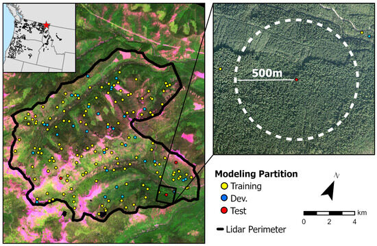 We sampled reference AGB values for our numerical experiments from the pre-processed lidar AGB maps. We then used these reference values to develop Landsat-based AGB models. We utilized a training/development/testing split to construct and validate the Landsat-based AGB models. The development set was used to assess model performance during hyperparameter tuning. The testing set was used to produce a final estimate of the model’s error. First, a single AGB layer was produced by compositing the 176 lidar maps, selecting at each XY location the most recent AGB estimate. The composited AGB map covered 9,361,622 ha of forested land. Second, the AGB layer was stratified into 30 bins using 25 Mg ha 1 increments. Next, the testing set was constructed by drawing 250 samples from each strata (n = 7500 ). Then, samples from the training and development sets were sampled. Training and development sets were not sampled within 500 m of any test-set samples to ensure our estimate of the models’ generalization error was not impacted by spatial autocorrelation (Figure 2). A threshold of 500 m was selected, as previous analyses concluded that the structure of Pacific Northwest forests varies at spatial lags <500 m [48,49,50]. Finally, 10,000 samples were drawn from each of the 30 strata (n = 300,000) and were allocated, by strata, to the training set (n = 240,000) and the development set (n = 60,000) using an 80–20%split.