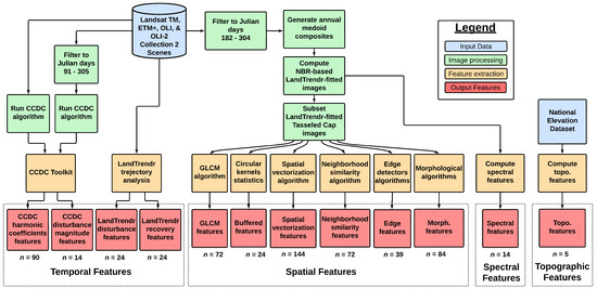 Temporal features characterizing the duration and severity of past disturbance events and forest recovery are commonly used to improve the accuracy of forest structure and land use/land cover models [7,19,74,75]. In total, 152 temporal features were computed using the LandTrendr and CCDC algorithms.