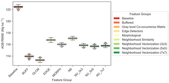 Compared with the baseline model, the GLCM features and buffer features produced the greatest improvement in AGB model performance of all the spatial feature engineering that were methodologies evaluated (Figure 4; Table 2). A comparison of the baseline model and the GLCM model error distributions indicated that the inclusion of GLCM features reduced the RMSE by 9.14 to 9.20 Mg ha 1 (95% confidence interval (CI); t = 642.89; p-adj ≤ 0.0001) and improved the R 2 score by 4.31 to 4.34% (95% CI; t = −604.06; p-adj ≤ 0.0001). Buffer features improved the RMSE by 8.49 to 8.55 Mg ha 1 (95% CI; t = 634.18; p-adj ≤ 0.0001) and R 2 by 4.01% to 4.04% (95% CI; t = −587.48; p-adj ≤ 0.0001). Morphological features and NV features yielded worse performance than GLCM and buffer features. The NS features were the worst performing spatial feature engineering techniques. Edge detector features nominally outperformed the NS features.