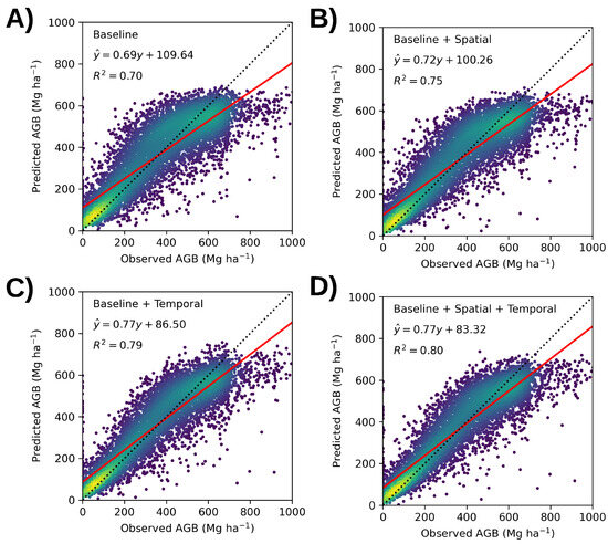 Figure 5. Predicted vs. observed AGB values from the second experiment comparing the AGB predictions generated by Random Forest models over the testing set. Models were produced using (A) the baseline features, (B) the baseline and spatial features, (C) the baseline and temporal features, (D) the baseline, spatial, and temporal features. The relationships are summarized using an ordinary least square regression curve (red line). The black dashed line is the one-to-one curve.