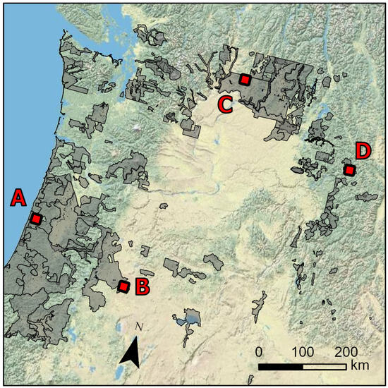 Figure 6. The location of the four 15 km 2 subsets (red squares) that were selected to visualize the outputs from the AGB models developed in experiment 2. The subsets are located in (A) the Coast Range in Oregon, (B) Eastern Oregon, (C) North Central Washington, and (D) Central Idaho.