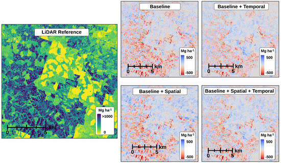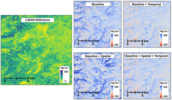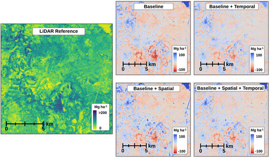 Figure 7. The reference lidar AGB map and the spatial residuals from each of the four models applied to a 15 km 2 area in the Oregon Coast Range. Red colors indicate that the model overestimated the lidar AGB density. Blue indicates that the model underestimated the lidar AGB density.