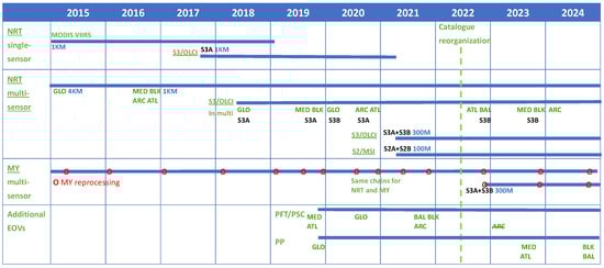 In 2015, the NRT regional products were based on single-sensors data; between 2016 and 2018, the multisensor datasets were introduced across the whole catalogue (Figure 1). Such datasets are based on harmonized multisensor time series of remote sensing reflectance (Rrs) acquired by different OC satellites, significantly increasing the spatial coverage of daily observations) [,,]. These products are available at 1 km spatial resolution for European seas, and at 4 km resolution for the global ocean. Since 2020, the MY processing chains have become fully consistent with the NRT multisensor processors, for all basins. Hence, the only difference between NRT and MY datasets lies in the upstream input data: the Level 2 (L2) granules processed with consolidated auxiliary data (hindcast meteorological and ephemerides data, usually available a few days after their acquisition) are used to produce the consistent and quality checked MY time series.