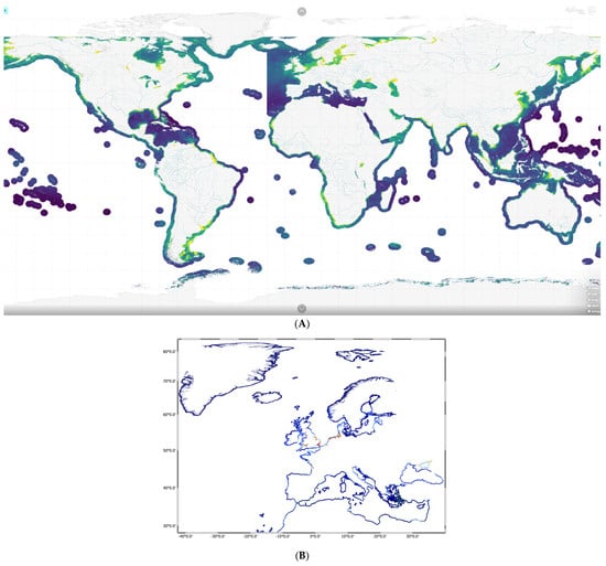 Spatial coverage of the Sentinel-3 OLCI 300 m and Sentinel-2 MSI 100 m datasets. (A) All European regional seas and a 200 km strip from the coastline in the global product for Sentinel-3 OLCI. (B) A 20 km strip from the coastline for the European coastal waters covered in 5 days with Sentinel-2 MSI.