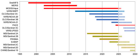 Over the years, the upstream data shifted from OC science missions—i.e., SeaWiFS (Sea-viewing Wide Field-of-view Sensor), MERIS (MEdium Resolution Imaging Spectrometer) and MODIS (Moderate Resolution Imaging Spectroradiometer)—towards operational missions (Figure 3). As well as the two OLCIs on the Copernicus Sentinel-3 A and B and three VIIRSs (Visible Infrared Imaging Radiometer Suites) on NOAA’s (National Oceanic and Atmospheric Administration) SNPP (Suomi-national polar-orbiting partnership), NOAA-20 and NOAA-21, the two MSI (MultiSpectral Instrument) sensors on the Copernicus Sentinel-2 A and B satellite are ingested for the coastal products due to their finer spatial resolution, although they were initially designed for terrestrial applications and have a revisit time of 3–5 days (Figure 3). In 2015, all NRT regional products were based on MODIS and VIIRS; between 2016 and 2018 these datasets were then replaced by multisensor datasets [,,] (Figure 1). The number of sensors contributing to the multisensor product time series changed over the years from one sensor (SeaWiFS) from 1997 to 2002, up to six sensors (MODIS-Aqua, VIIRS-SNPP/NOAA-20/NOAA-21, and OLCI-Sentinel-3A/B) from late 2022 to the moment of writing (Figure 3).
