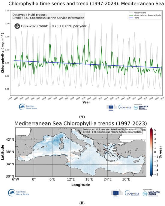 Within CMEMS, OCTAC also contributes to ocean monitoring through the distribution of specific operational indicators delivering information on the state, variability, and change of CHL for all regions. To ensure state-of-the-art ocean monitoring in real time, the ocean monitoring indicator (OMI) framework requires that the indicator time series, their visualization, a description, and additional documents such as product and quality information are updated regularly in an operational mode []. As an illustration of the contributions to operational ocean monitoring, Figure 4 presents the Mediterranean Sea CHL trend analysis, derived from two operational OMIs (1997–2023) of satellite CHL based on the CMEMS L4 product.