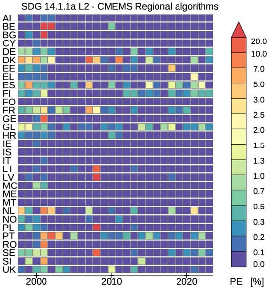 As an example of the CMEMS contributions to Sustainable Development Goal (SDG) reporting, Figure 5 presents the 1998–2023 time series of the potential eutrophication (PE) for European waters based on the OC regional products. The SDG reporting for 14.1.1a Level 2 sub-indicator for European countries, which measures the index of coastal eutrophication, is carried out operationally by CMEMS in a harmonized, consistent, and integrated manner using satellite-derived CHL-a data to generate a single variable indicator [,]. The methodology for reporting on indicator 14.1.1a builds on the UNEP (United Nations Environment Programme) progressive monitoring approach based on both globally and nationally derived data and supplemental data to report on SDG indicators []. For each year, a satellite-based map of potential eutrophic areas in the European Seas is generated by comparing the per-pixel CHL-a data from the MY regional products in the reporting year with the corresponding CHL-a climatological 90th percentile (P90) established for a 20-year baseline (1998–2017) []. Then, the PE time series of PE potential eutrophication is calculated by performing for each year a spatial average of the PE map, weighted by pixel area over the exclusive economic zones (EEZs) of each European country [].