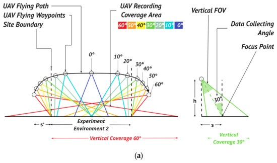 where is the vertical FOV of the camera, is the distance between the camera and the focal point at recording angle A, and is the horizontal distance between the UAV at the position of recording angle A and the boundary of experiment environment 2. A positive value indicates that the UAV was outside the boundary of the experimental area. A negative value indicates that the UAV was inside the boundary of the experimental area. Finally, is the horizontal distance between the UAV and the focal point of the camera at recording angle A, and is the height of the UAV at recording angle A.