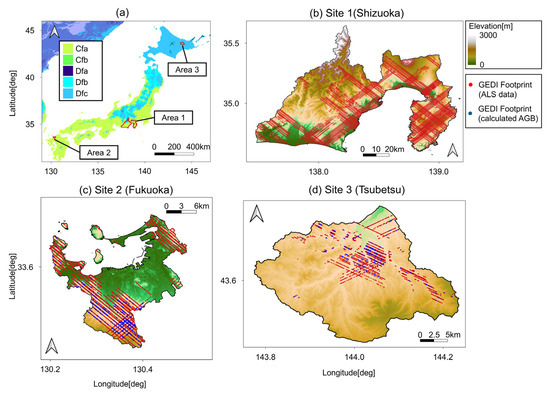 Study sites in Japan. (a) Geospatial location and Köppen–Geiger climate classification of Area 1 to Area 3 in Japan. Cfa is humid subtropical climate, Cfb is oceanic climate, Dfa is hot-summer humid continental climate, Dfb is warm-summer humid continental climate, and Dfc is subarctic climate. (b) GEDI footprint at ALS observation sites in Area 1 (Shizuoka: mostly Cfa warm oceanic climate, wide range of elevations and steep terrain). (c) GEDI footprint at ALS observation sites and AGB calculation site in Area 2 (Fukuoka: similar climate with Area 1, planted needleleaf forest). (d) GEDI footprint at ALS observation sites and AGB calculation site in Area 3 (Tsubetsu: mostly Dfc subarctic climate).