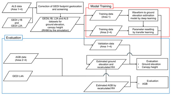 For this study, we collected data from the Geolocated Waveforms product (Level 1B, GEDI L1B) and the Geolocated Elevation and Height Metrics product (Level 2A, GEDI L2A) of the GEDI mission, which are currently available at the Land Processes Distributed Active Archive Center (LP DAAC), covering observations from April 2019 to December 2021. Additionally, we gathered data from the Footprint Level Aboveground Biomass Density product (Level 4A, GEDI L4A), available at the Oak Ridge National Laboratory Distributed Active Archive Center (ORNL DAAC), for the same period and regions. These data products were linked using the unique footprint ID assigned to each observation. Observations without valid waveforms, where GEDI L2A processing was not performed, were excluded from the analysis using flags in the GEDI L1B data. For GEDI L4A, only data with valid AGB values greater than or equal to zero were used. We also applied flags related to leaf-off periods, derived from the NPP VIIRS Global Land Surface Phenology Product, and used the upper and lower confidence intervals (response_max_value and response_min_value) predicted by the statistical model to ensure that only appropriately calculated AGB data were included.