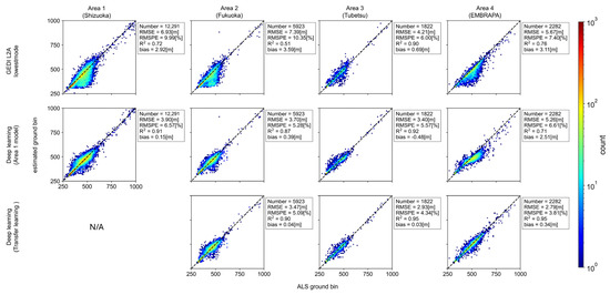 The deep learning model, built using over 100,000 GEDI waveforms and corresponding ground position data from the diverse terrain and vegetation conditions in the wide range of terrain in the warm oceanic climate site (A1), showed acceptable generalization in the needleleaf-planted forests in the warm site (A2), the boreal site (A3), and the tropical forest site in South America (A4), even though the model was trained with data from a limited region. This may be because, while GEDI waveforms provide diverse data on vegetation structure, the overall variation in waveform patterns is relatively limited [53]. Additionally, from the deep learning results shown in Figure 5, we see that the deep learning model trained solely with data from A1 demonstrated a better ground elevation estimation accuracy than GEDI L2A in A1 and A2. However, in A3 and A4, the ground elevation estimation accuracy improvement over GEDI L2A was not as pronounced. For A3, this may be because the ground elevation estimation accuracy in GEDI L2A was already higher than in the other areas, resulting in smaller differences. In A4, considering that differences in climate and terrain affect forest structure [54,55], the data from A1, while diverse in terms of terrain and vegetation, may not have sufficiently captured the structural differences between Japan’s temperate forests (A1, A2, and A3) and the tropical forests in A4. As a result, the model struggled to accurately distinguish between canopy and ground signals in the waveforms from A4, leading to a limited performance improvement over GEDI L2A.