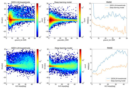 The results from the wide range of terrain in the warm oceanic climate site (A1), needleleaf-planted forests in the warm site (A2), the boreal site (A3), and the tropical forest site in South America (A4) show that the deep learning method for ground elevation estimation from GEDI observation waveforms using data from limited regions was more accurate than GEDI L2A. This is because GEDI L2A estimates the ground signal through peak detection after smoothing the GEDI observation waveform, while the proposed method captures the characteristics of the waveform using convolution in the deep learning model. As a result, it can handle cases where the ground reflection signal is not clearly represented in the waveform, such as in locations with steep terrain or a high crown cover ratio, which often obscure the ground signal in the waveform. As seen in Figure 5, GEDI L2A’s algorithm, which uses peak fitting techniques, can erroneously estimate the ground elevation from canopy signal peaks in waveforms from steeply sloped areas where only canopy signals are present. This explains why the error at higher altitudes did not decrease, even as the ground_bin SNR increased in Figure 6. In contrast, the deep learning method can distinguish between waveforms characterized solely by ground signal peaks and those characterized solely by canopy signal peaks, enabling it to estimate the ground elevation accordingly. Estimating the ground elevation from GEDI waveforms that only exhibit canopy signal peaks is more difficult, so the method of identifying the ground elevation from the waveform’s lower section results in a lower ground_bin SNR and greater uncertainty. Conversely, this method identifies GEDI waveforms with clear ground signal peaks as ground elevation, which are easier to analyze and result in a higher ground_bin SNR and lower uncertainty. Even on slopes, it has been made clear in previous studies that the large rider footprint with a diameter of 25 m is affected [51,52], and in Figure 6, the correspondence between the increase in slope and the increase in RMSE was confirmed.