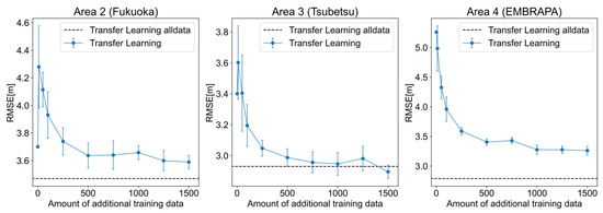 Relationship between the amount of data used for transfer learning in each area and ground elevation estimation accuracy.