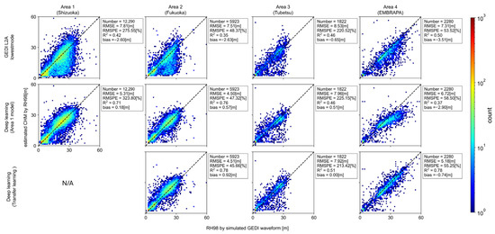 Figure 7 shows the relationship between the amount of data used for transfer learning and changes in accuracy. In the tropical forest site in South America (A4), the more data are added, the more improved the estimation accuracy becomes. However, in the needleleaf-planted forests in the warm site (A2) and the boreal site (A3), adding a small amount of data, around 10 to 100 samples, decreased the accuracy. Since A4 features tropical forests with distinctive vegetation and vertical structures that do not present over the wide range of terrain in the warm oceanic climate site (A1), the parameters were properly updated with each data addition, leading to an improved estimation accuracy. On the other hand, for A2, the GEDI observation waveforms added for transfer learning were more localized, and depending on the selected data, they may not have contributed to any improvement. The number of samples representing the terrain and vegetation is crucial [60], and this study found that fewer than 200 samples were insufficient to represent the landscape for reconfiguring the deep learning model parameters at the regional level. In particular, for A2, the transfer learning in this study changed all parameters during training, so overfitting may have occurred due to the localized waveforms selected as additional learning data, leading to unintended parameter settings.