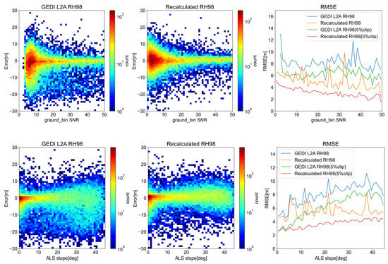 Similar to the analysis of ground elevation estimation, Figure 9 shows the relationship between the error in RH98, calculated by each method, and the RH98 from the simulation waveforms, ground_bin SNR, and the average slope within the footprint calculated from ALS data. To exclude the influence of outliers when calculating the RMSE for each class, the top 5% of errors were excluded, and the RMSE values without these outliers are also shown. The results indicated that, as observed in Figure 6 for the analysis of ground elevation estimation accuracy, the RMSE decreased as the ground_bin SNR increased, while the RMSE increased as the slope increased. However, that tendency is weaker compared to Figure 6.